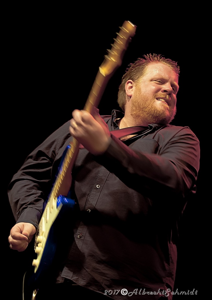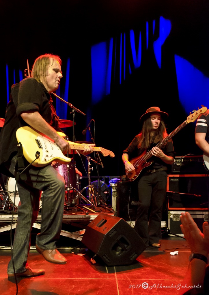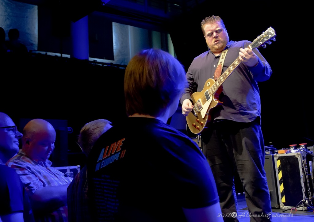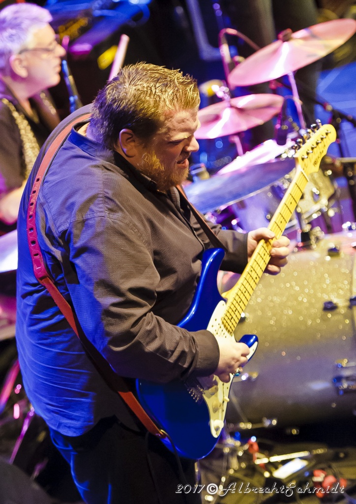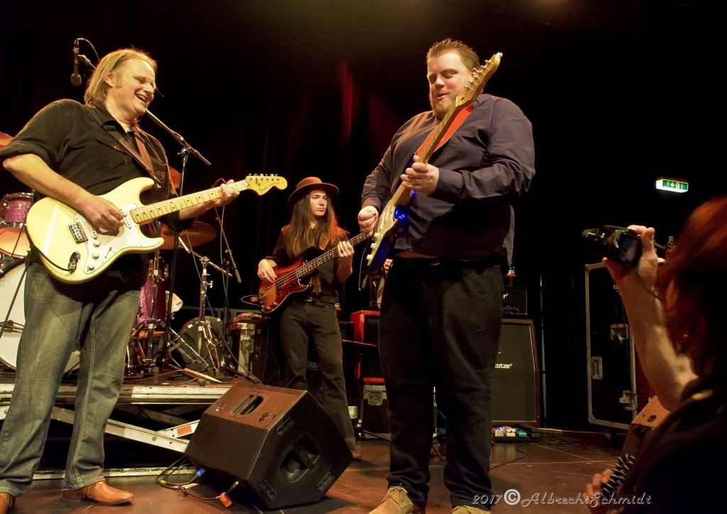 Laune machte neben der Standard-Formation mit Sammy Avila (ließ seine Hammond ordentlich gurgeln), dem tierisch Gas gebenden Drummer Michael Leasure und dem Benjamin, Adam Ditt am Bass (wirkte, vermutlich aufgrund der Schwergewichte um sich herum, etwas schüchtern, zupfte aber sehr solide) vor allem auch die Einbindung der Gäste wie Sohnemann Jon, der auch bewies, dass er die musikalischen Gene des Vaters intus hat (wirbelte ebenfalls schon gehörig auf seiner hellblau-weißen Strat, dazu mit gutem Kurz-Lead Vocals-Einsatz), Sänger Andrew Elt (überwiegend Harmoniegesänge, einmal kurz als Fronter) und dem beim furiosen „The Blues Came Callin'“-Jam dazu stoßenden und erneut glanzvoll aufgelegten Danny Bryant.