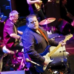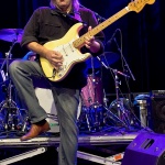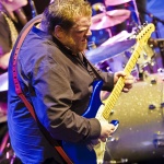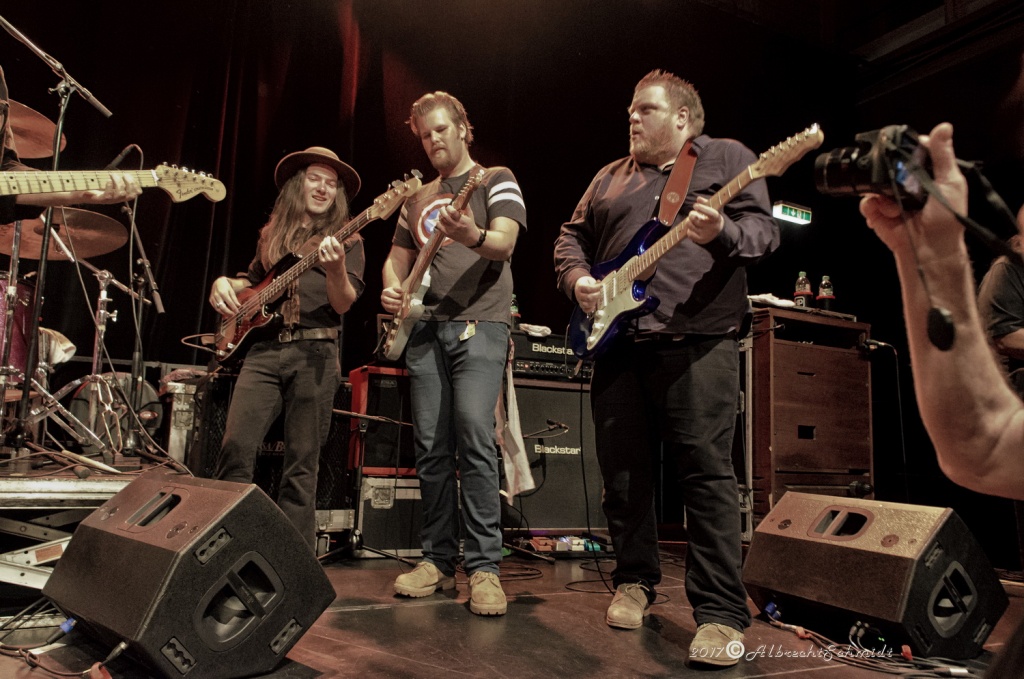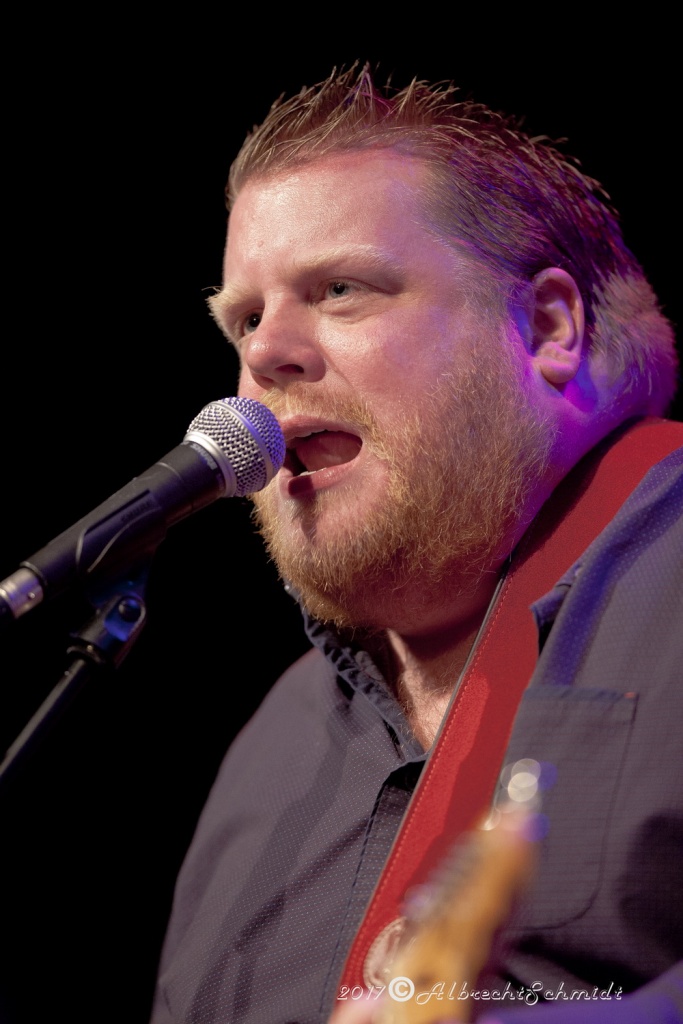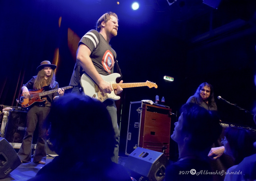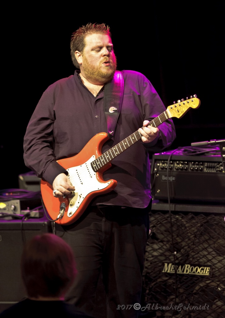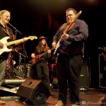 Laune machte neben der Standard-Formation mit Sammy Avila (ließ seine Hammond ordentlich gurgeln), dem tierisch Gas gebenden Drummer Michael Leasure und dem Benjamin, Adam Ditt am Bass (wirkte, vermutlich aufgrund der Schwergewichte um sich herum, etwas schüchtern, zupfte aber sehr solide) vor allem auch die Einbindung der Gäste wie Sohnemann Jon, der auch bewies, dass er die musikalischen Gene des Vaters intus hat (wirbelte ebenfalls schon gehörig auf seiner hellblau-weißen Strat, dazu mit gutem Kurz-Lead Vocals-Einsatz), Sänger Andrew Elt (überwiegend Harmoniegesänge, einmal kurz als Fronter) und dem beim furiosen „The Blues Came Callin'“-Jam dazu stoßenden und erneut glanzvoll aufgelegten Danny Bryant.