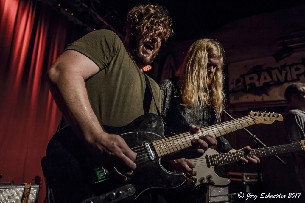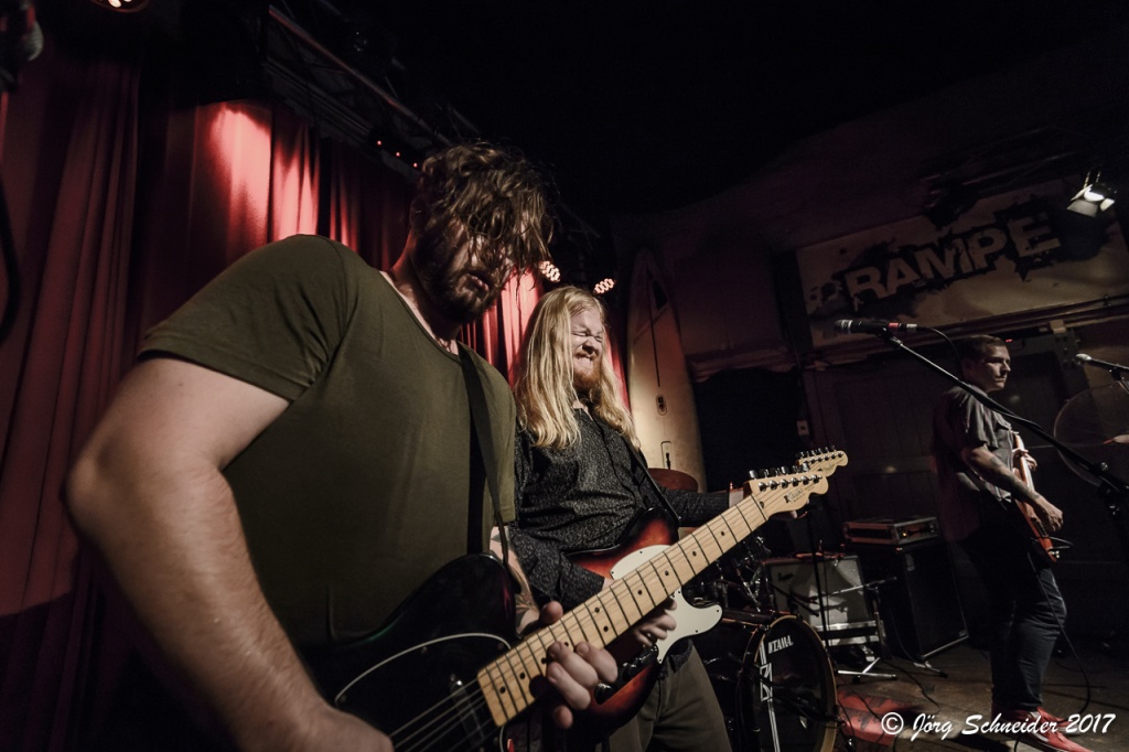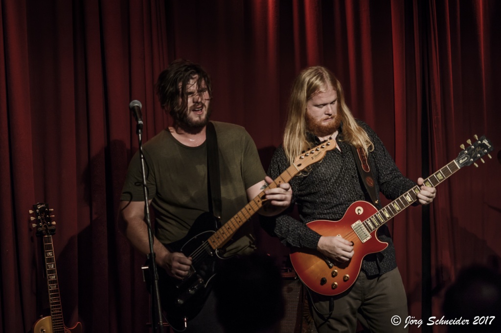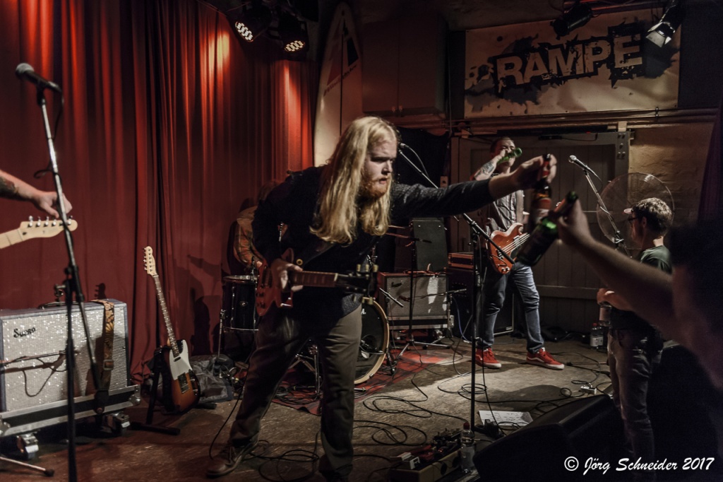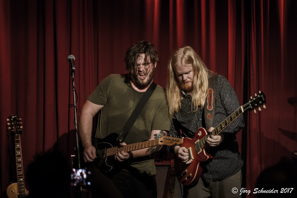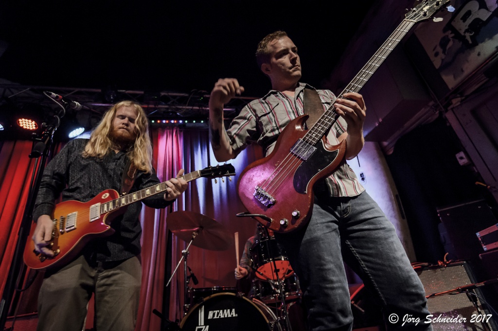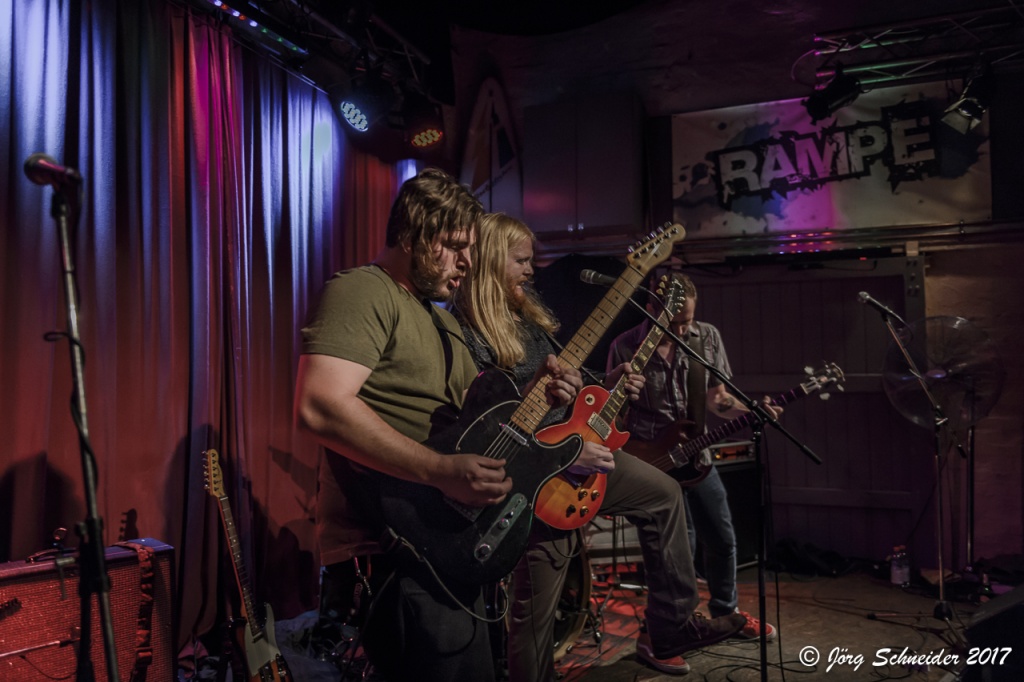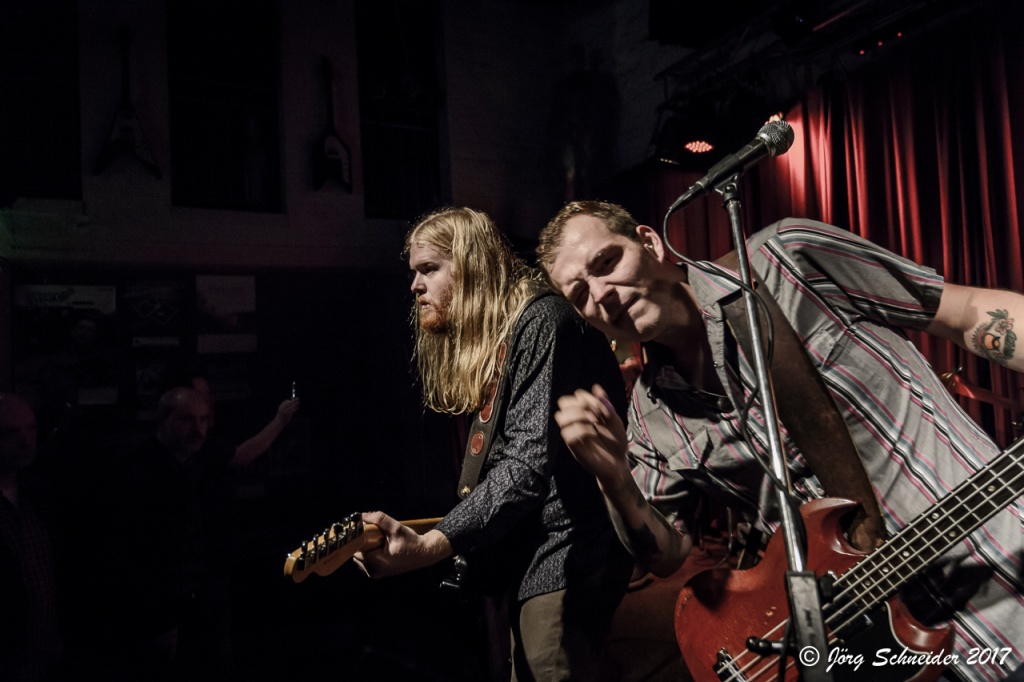 Der Titel „Feeling Fine“, mit dem die Band aus Alamance, North Carolina, loslegte, war zugleich Programm für die nächsten hundert Minuten. Die Begeisterung, mit der Jive Mother Mary den Auftritt bestritten, schwappte direkt auf die Gäste der Kulturrampe über. Dass mit „Long Odds“ und „Burning Up The Highway“ zwei bislang unveröffentlichte Songs auf den Opener folgten, ist zwar ungewöhnlich, tat der Stimmung aber keinen Abbruch. Beim zweitgenannten übernahm Gitarrist Tyler Schulz anfänglich die lead vocals. Keck und Schulz legten sich anschließend bei „Down South Manifesto“ mit zweistimmigem Gesang und Twin-Gitarren mächtig in Zeug.