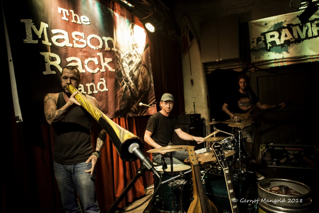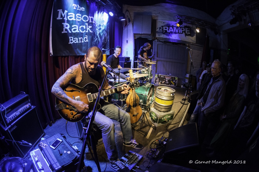 Nach einigen Jahren Pause kam der von Pille Peerlings angekündigte Rampenklassiker, die Mason Rack Band aus Australien, wieder nach Krefeld. Wie immer war es für die Besucher nicht vorhersehbar, was sie an diesem Abend erwarten würde, da selbst die Mannen um Mason Rack vor dem Konzert nicht wissen, wie der Ablauf sein wird. Die von Bands oft verwendete Setliste wird bei den Mannen aus Down Under ersetzt durch spontane Geistesblitze Masons, der entweder in einen Song einsetzt oder es mit den beiden anderen kurz abstimmt und los geht’s.