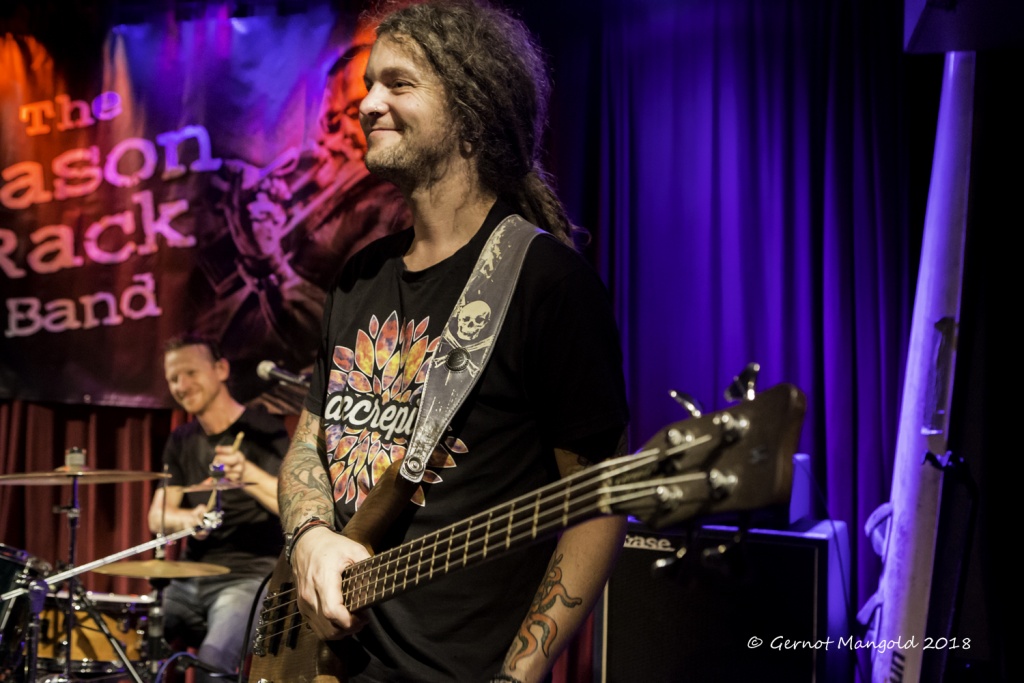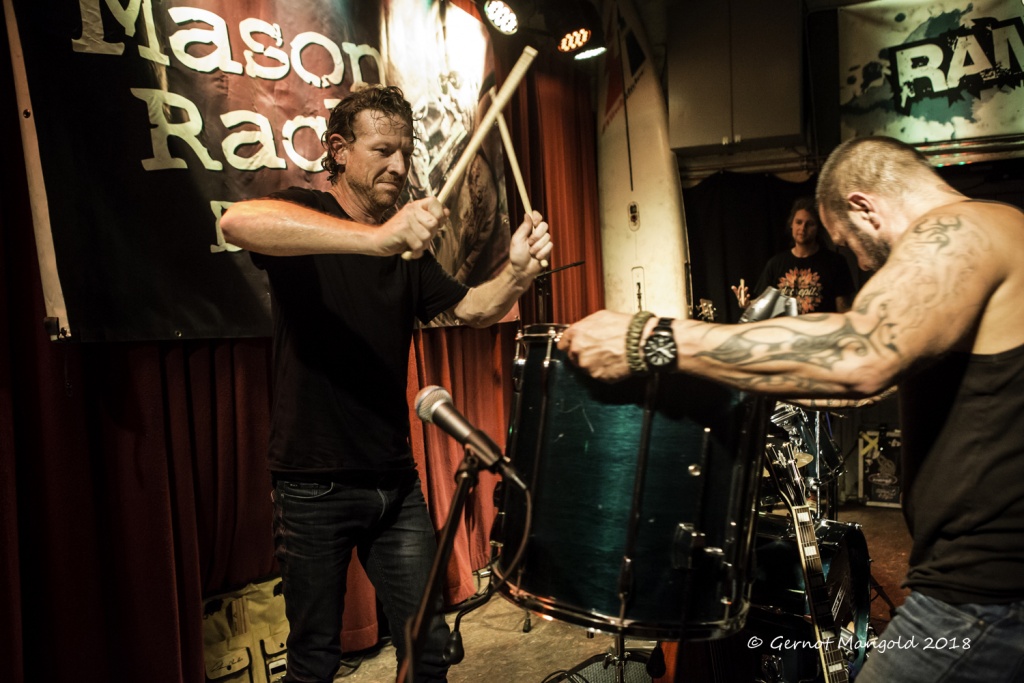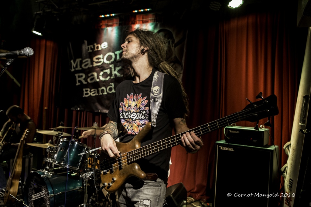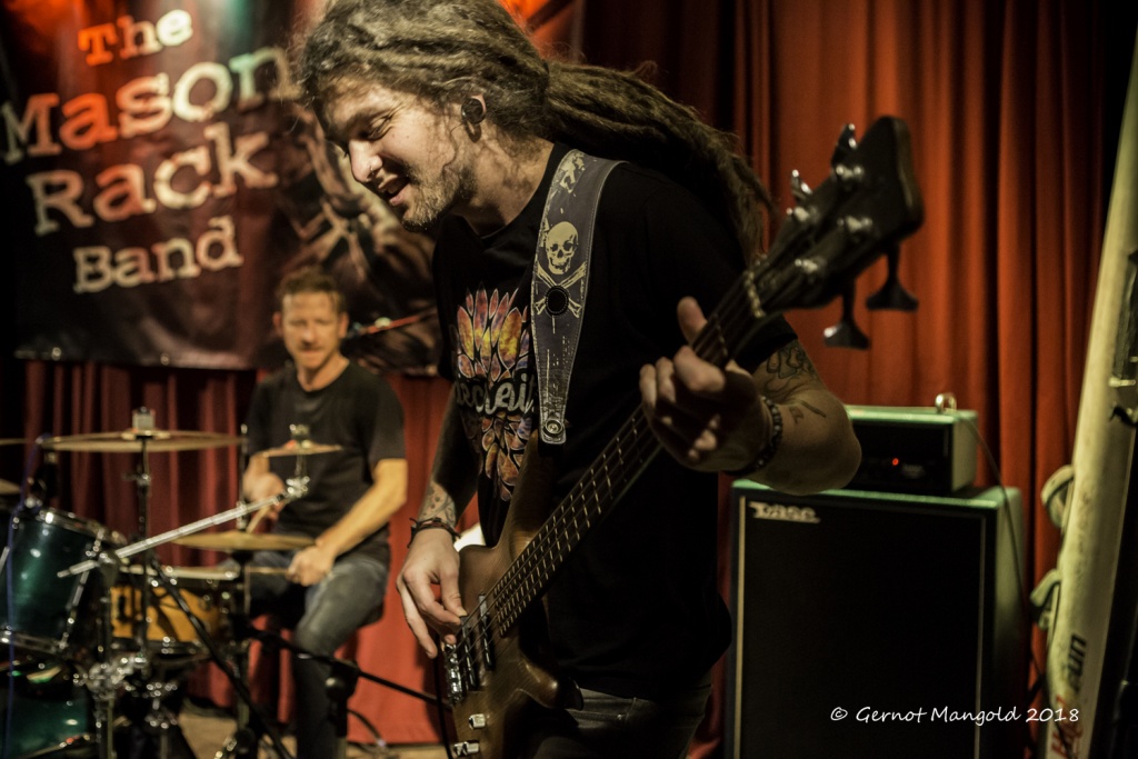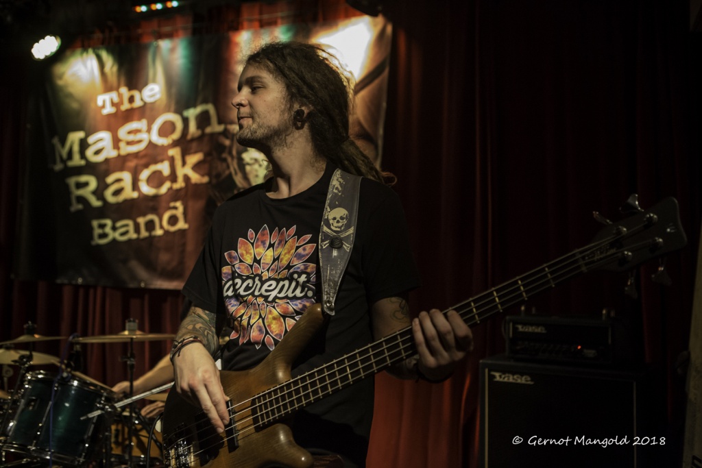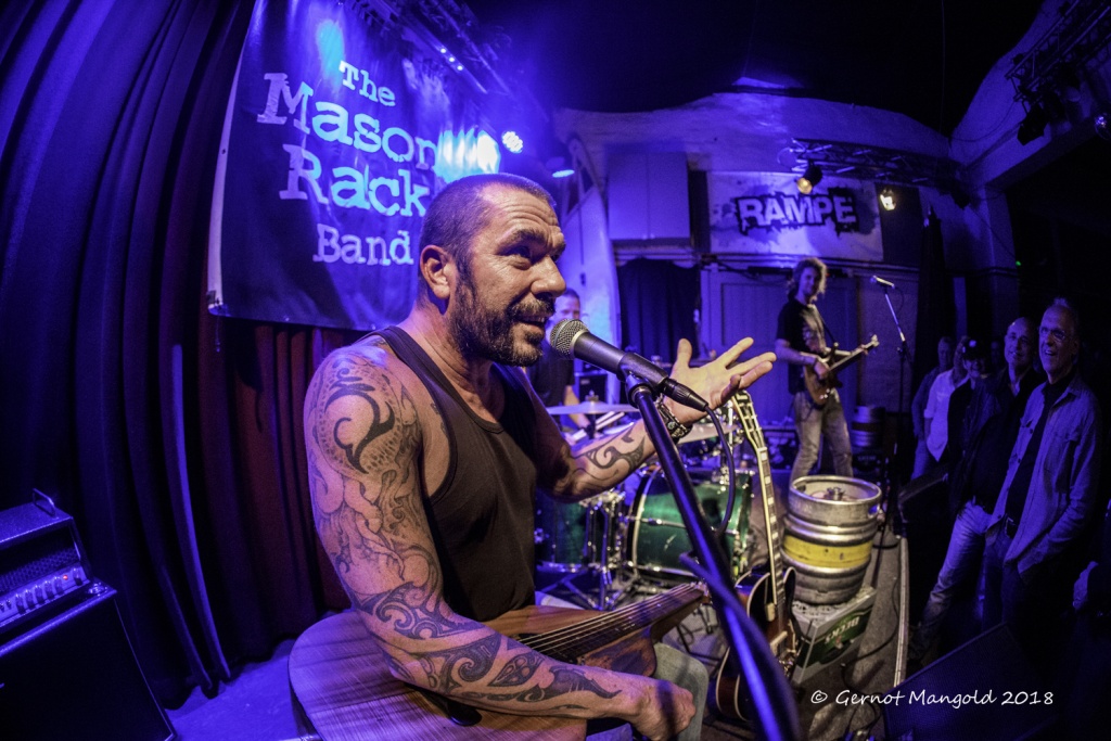 War es Roots, war es Blues, war es Punk, war es Rock? Alles in einen Sack gepackt, einmal durchgemischt und heraus kam der typische Stil der Mason Rack Band, an dem Liebhaber verschiedenster Musikgenres Spaß haben können. Die tiefe, ungehobelt kratzige Stimme erinnerte zum Teil an Joe Cocker, Roger Chapman, aber auch zum Teil an den Gesangsstil von Billy Idol. Interessant, war der Grundrhythmus von „Naughty Girl“, aus dem die Band jederzeit in den legendären Klassiker „Personal Jesus“ von Depeche Mode hätte überleiten können. Bei „Hard Goodbye“ zeigte die Band, dass sie auch langsame, melancholische Roots-/Bluessongs authentisch präsentieren kann.