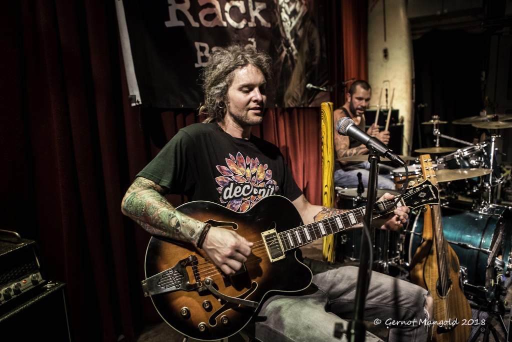 Nach dem Vorspiel nahm Herr Rack auf einer Transportbox Platz, von der er den Großteil des Konzertes seine Slideguitar sowie seine Ibanez sitzend bearbeitete. Insbesondere im ersten Act wurde eine Atmosphäre gezaubert, welche auch in die Kneipe vom Terrantino-Klassiker „From Dusk Till Dawn“ gepasst hätte. Für mich herausragend im ersten Teil des Konzertes waren die stilistisch schwer einzuordnenden Songs „Purple And Blue“ und „Naughty Girl“.