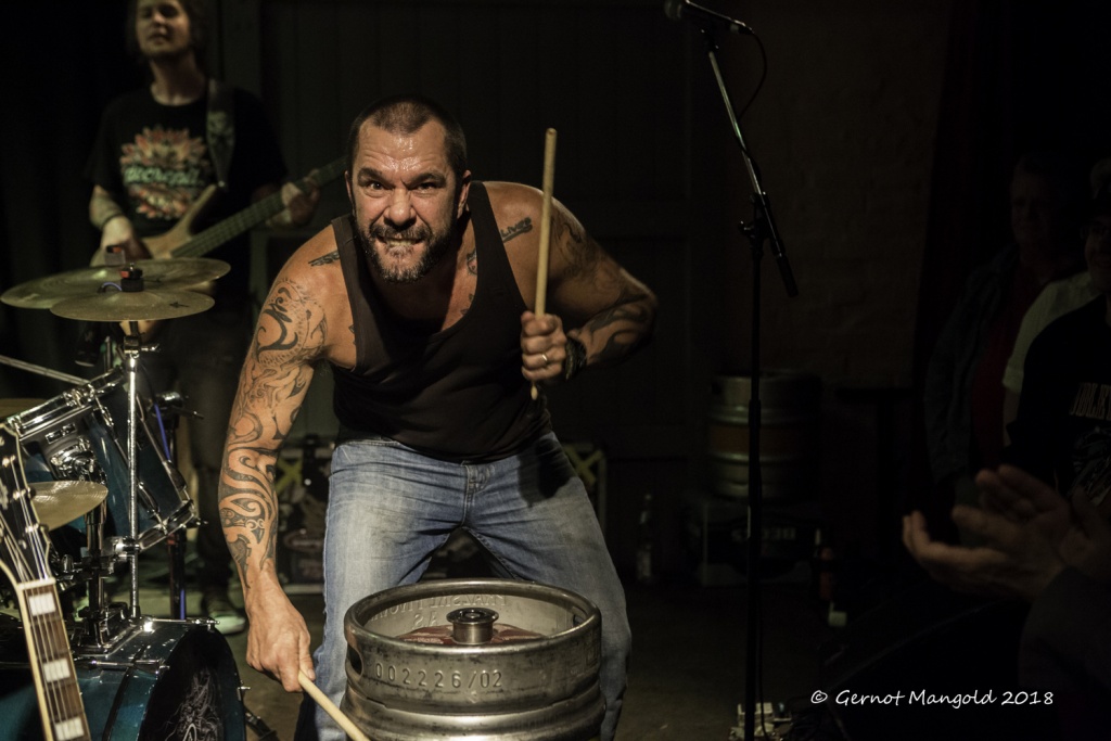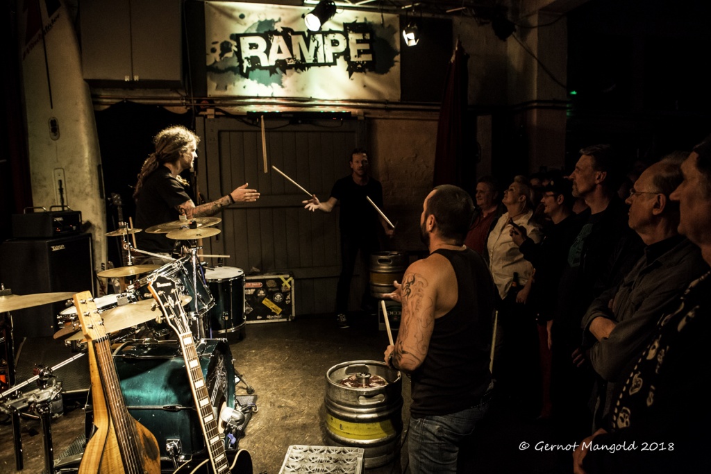 Gegen 20:30 wurde das Licht in der Rampe gedämpft und eine Glocke in der Kneipe der Rampe deutet an, dass das Konzert gleich beginnt. Wie fast immer, stellte Pille die Band vor, welche sich zuvor schon durch das Publikum der bestens gefüllten Rampe gekämpft hatte, zeigte augenzwinkernd auf zwei leere metallene Bierfässer, die er und Ton- und Lichttechniker Malte Menzer gestern noch schnell leer gemacht hatten, da diese hier später noch benötigt würden. Für diese „Tat“ am Vorabend hatte Malte wieder einmal einen tollen transparenten Sound und die entsprechende visuelle Untermalung in die Rampe gezaubert.