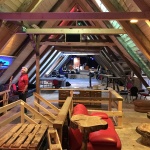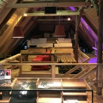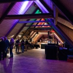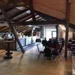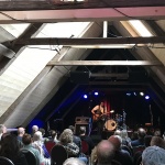 Und so begab sich pünktlich um 19.45 Uhr das erwartungsfrohe Quartett auf den ausgebauten Scheunen-Dachboden des Biobäckers Gerd. Nicht ohne auf dem Weg dorthin einem Getränkewagen, einem Frühstücks- und Imbissbereich und einem Festzelt zu begegnen. Oben angekommen war erst recht Staunen angesagt. Sehr viel Holz, tolle Balkenkonstruktionen (fast wie ein Kirchenschiff!), ganz hinten im Raum ein kleiner Tribünen-Loungebereich, in der Mitte ein großzügiges Theken-Sit-in-Konzept, ein vergleichsweise kleines Mischpult, eine kleine Bühne für einen Kameramann, der sich als Bassist von Lake herausstellen sollte und schließlich der recht schmale Raum vor der eigentlichen Konzertbühne auf der Frontseite der Scheune.