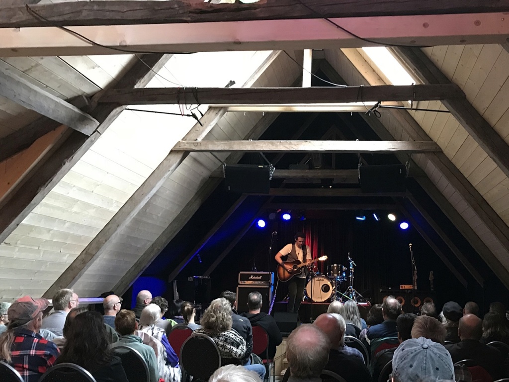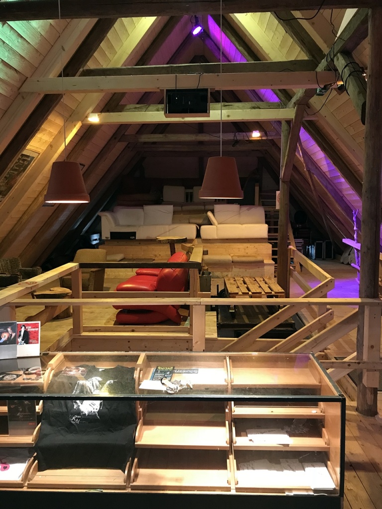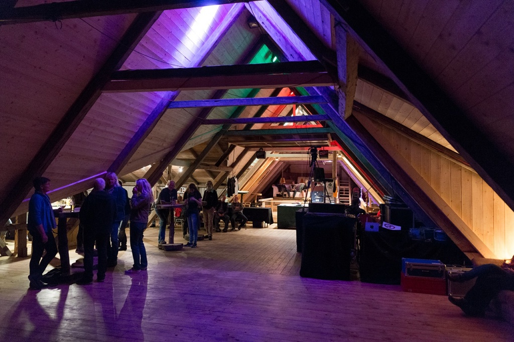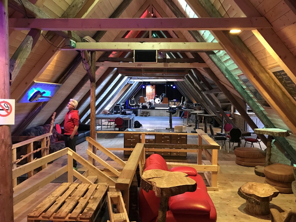 Und so begab sich pünktlich um 19.45 Uhr das erwartungsfrohe Quartett auf den ausgebauten Scheunen-Dachboden des Biobäckers Gerd. Nicht ohne auf dem Weg dorthin einem Getränkewagen, einem Frühstücks- und Imbissbereich und einem Festzelt zu begegnen. Oben angekommen war erst recht Staunen angesagt. Sehr viel Holz, tolle Balkenkonstruktionen (fast wie ein Kirchenschiff!), ganz hinten im Raum ein kleiner Tribünen-Loungebereich, in der Mitte ein großzügiges Theken-Sit-in-Konzept, ein vergleichsweise kleines Mischpult, eine kleine Bühne für einen Kameramann, der sich als Bassist von Lake herausstellen sollte und schließlich der recht schmale Raum vor der eigentlichen Konzertbühne auf der Frontseite der Scheune.
