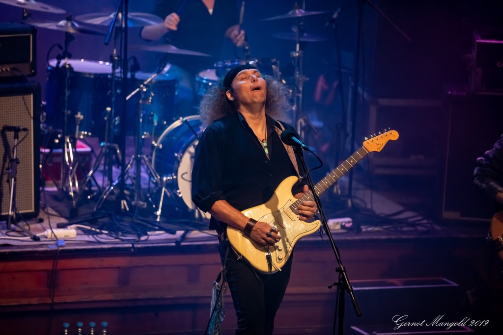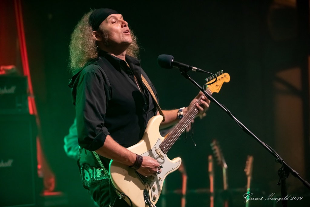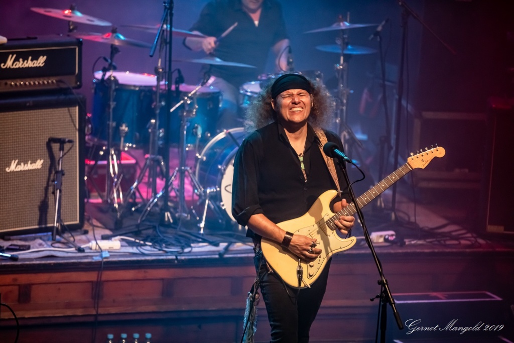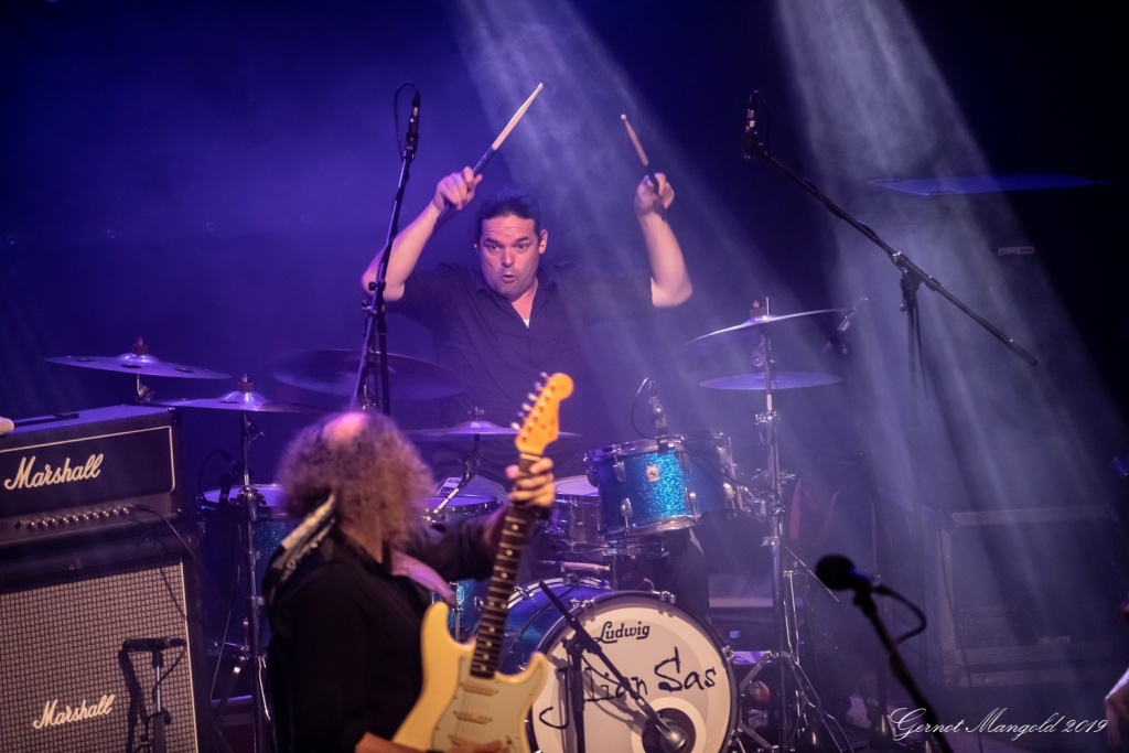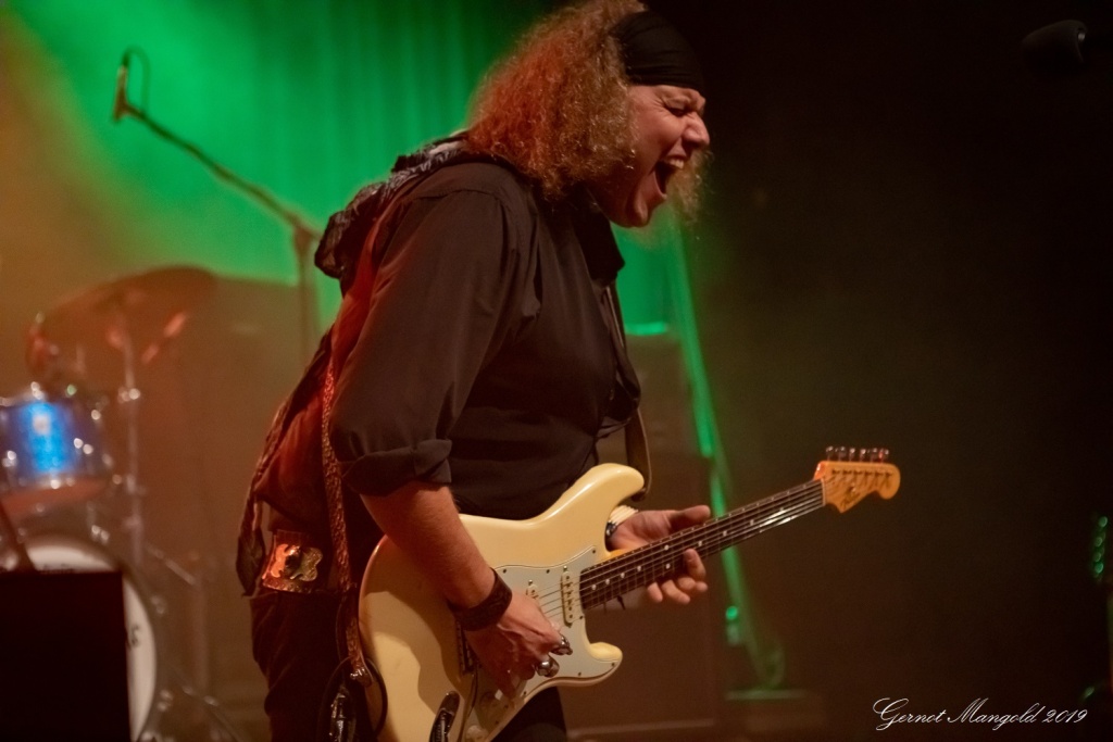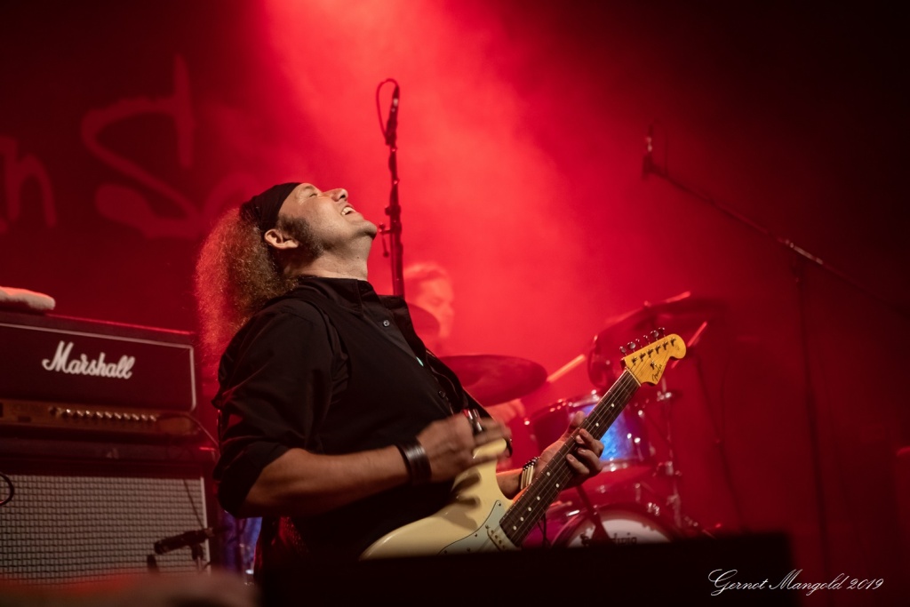 Schon „Makin My Return“ wies auf Julians Vorbild Jimmy Hendrix hin, was spätestens besonders deutlich wurde, als unmittelbar darauf psychedliesches Gespiel von Bakker und Julian an der Gitarre „Hey Joe“ einleiteten. Sas und Band zelebrierten diesen Rock-Evergreen regelrecht über knapp 10 Minuten, wo sich auch Fotis Anagnostou am Bass mit starker Mimik und Posen einbrachte.