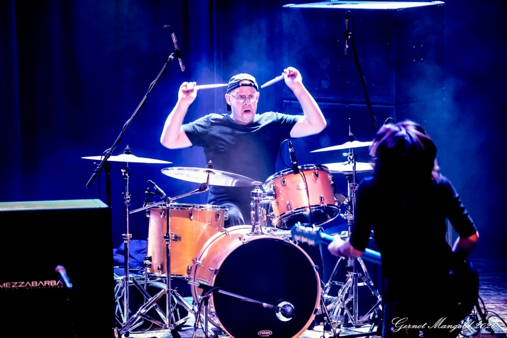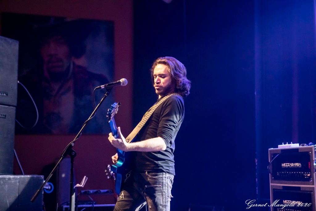 “Best With You” spiegelte vom Titel ein klein wenig die Stimmung im Piano wieder, wo sowohl die Band wie auch die Zuschauer gemeinsam das Beste aus den wiedrigen Begleitumständen machten. Mit “We’re Still Friends” zog dann zunächst ein Hauch von Melancholie durchs Piano, ein langsamer Bluessong, bei dem zu Beginn einige Töne an Jimi Hendrix erinnerten, der sich von einem riesigen Bild neben der Bühne vermutlich wohlwollend und staunend das Treiben auf der Bühne betrachtete.
