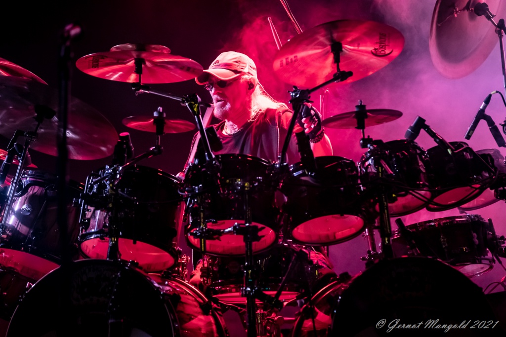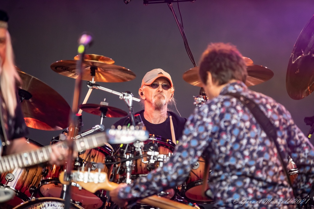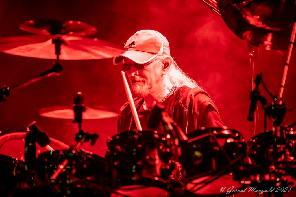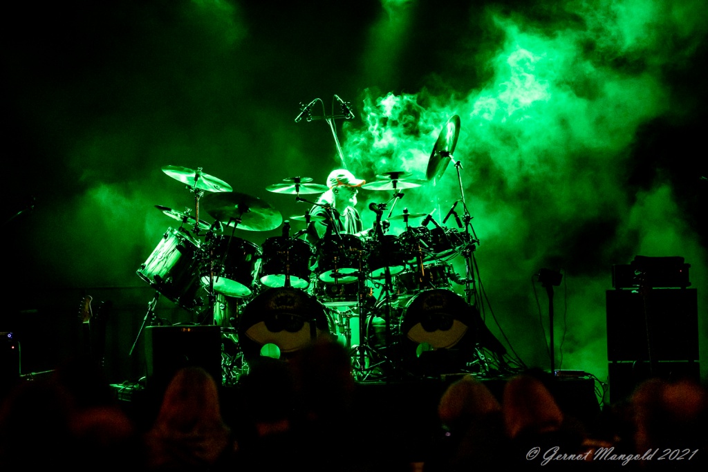 Die Rhythmusfraktion um den zuweilen stoisch den Bass zupfenden Hannes Vesper und das ‚Tier‘ Manni von Bohr an den Drums sorgte für eine Klasse Grundlage der Songs, konnte aber auch mit gekonnter Soloarbeit überzeugen. Rein optisch hatte man auch fast das Gefühl, die Drums würden die ganze Bühne einnehmen.