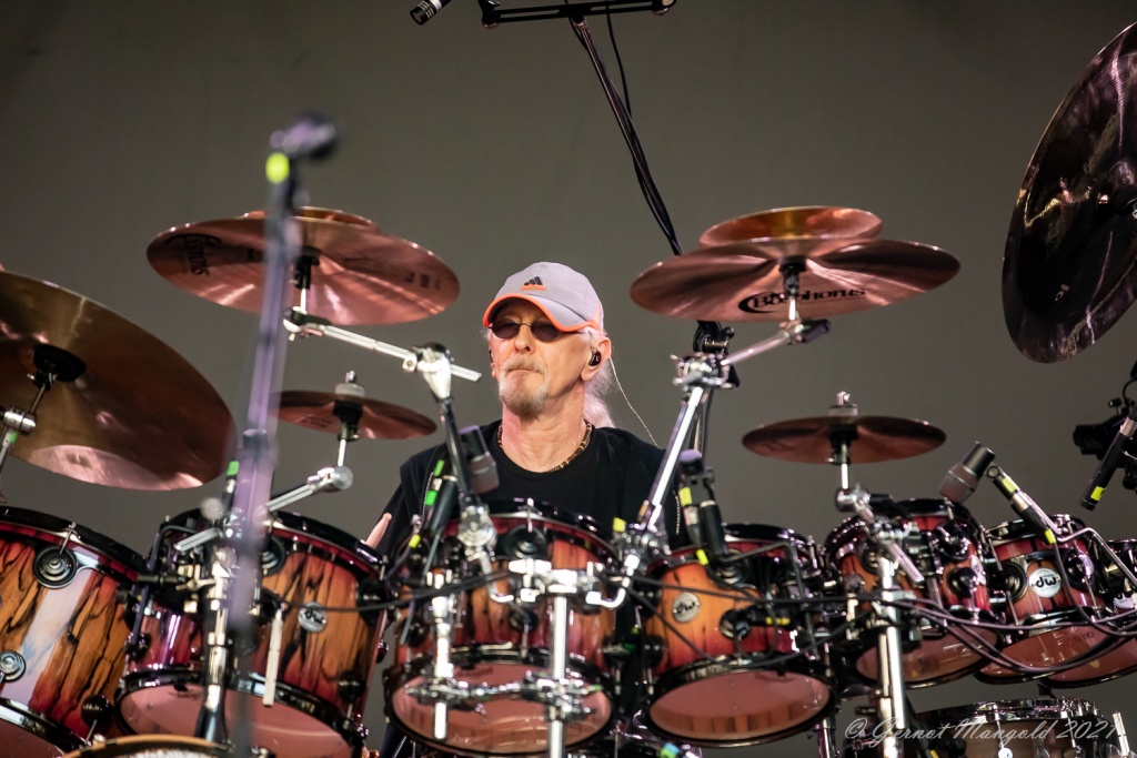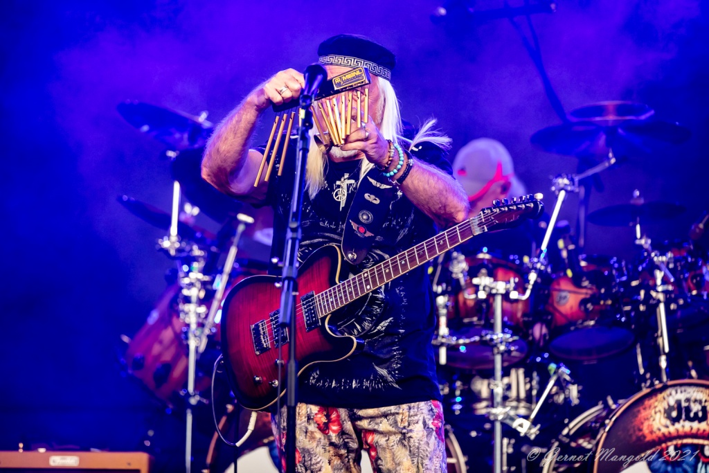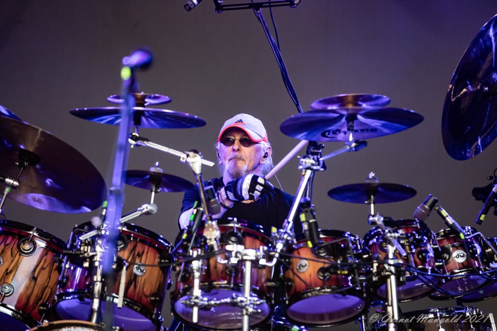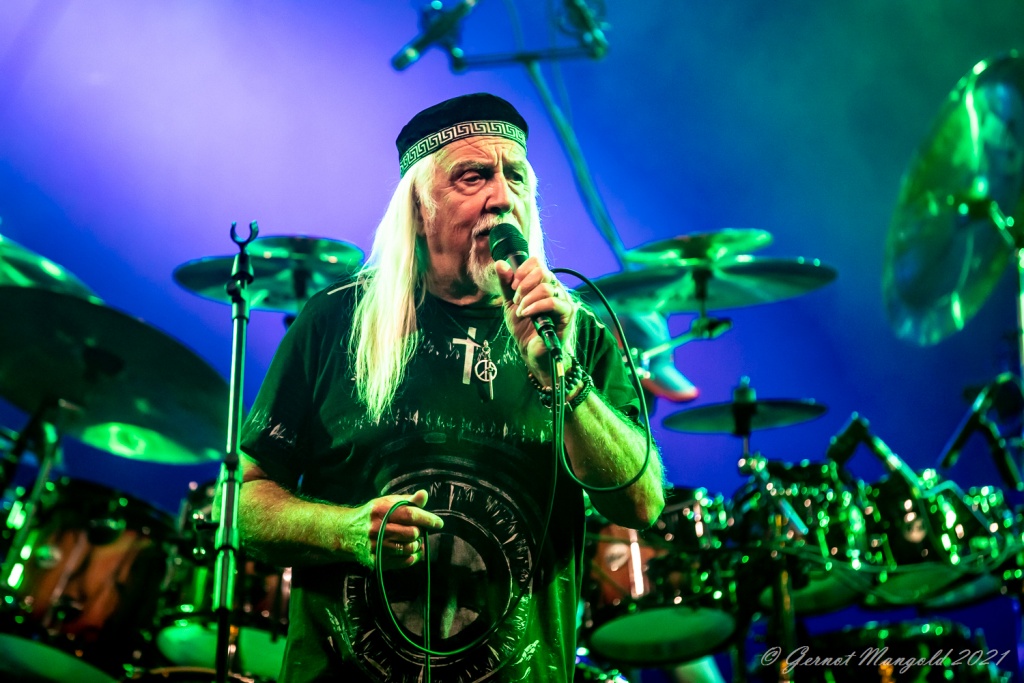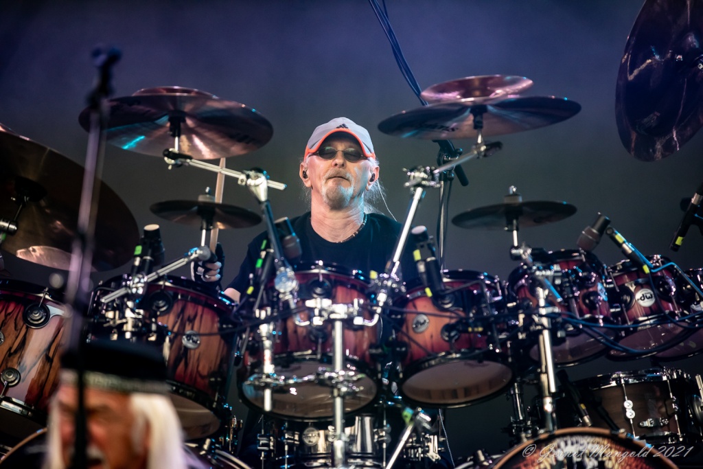 Die Rhythmusfraktion um den zuweilen stoisch den Bass zupfenden Hannes Vesper und das ‚Tier‘ Manni von Bohr an den Drums sorgte für eine Klasse Grundlage der Songs, konnte aber auch mit gekonnter Soloarbeit überzeugen. Rein optisch hatte man auch fast das Gefühl, die Drums würden die ganze Bühne einnehmen.