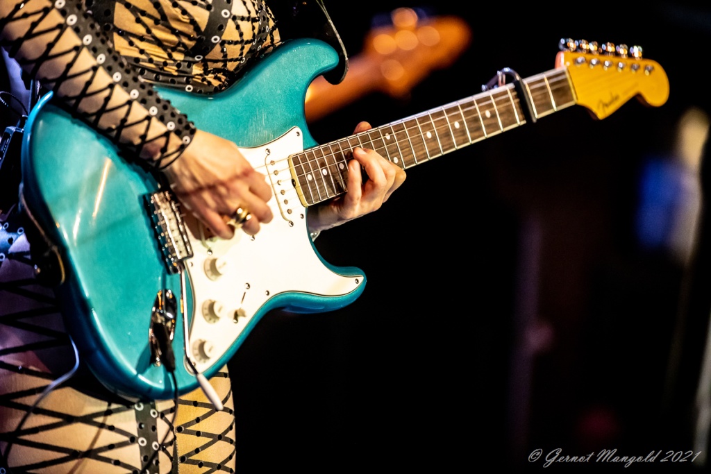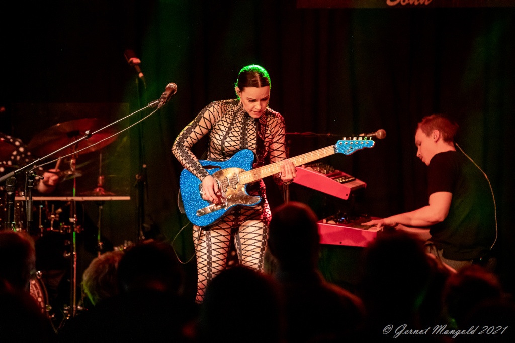 Schon mit der Begrüßung zu Beginn des Konzertes brachte die charmante Finnin die Besucher direkt hinter sich und es sollen rasante knapp 100 Minuten Powerblues folgen, bei denen natürlich Erja meist im Mittelpunkt des Geschehens stand. Sichtlich gut gelaunt moderierte sie teilweise humorvoll posend die Songs an und wies augenzwinkernd darauf hin, dass sie sich passend zum Tag, in ihre Sonntagsgarderobe geschmissen hatte. Das sie den Titel ‚Queen of Sliding‘ nicht umsonst trägt, bewies sie bei einigen zuweilen furiosen Soli, wo sie mit dem Bottleneck regelrecht über die Saiten ihrer Gitarren jagte.