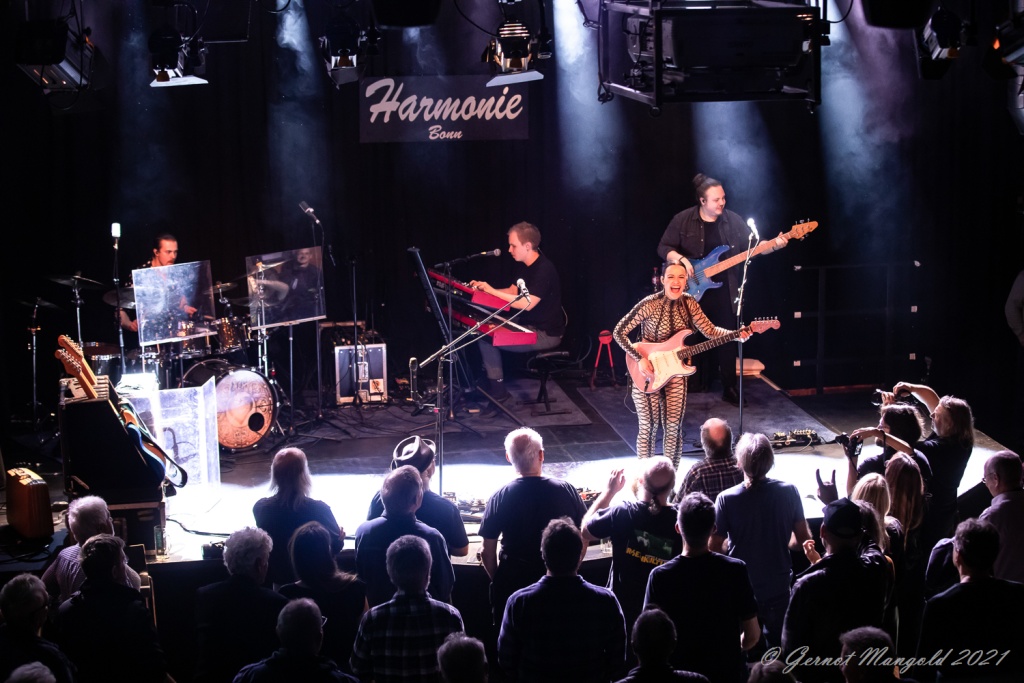 Mit Applaus begrüßten die Fans, welche die Harmonie etwa zu einem Drittel füllten, die Band und Manou stellte diese kurz vor. Dabei merkte man ihr zunächst das Lampenfieber vor diesem ersten Auftritt noch leicht an, was sie auch nicht verhehlte. Im weiteren Verlauf machte Sie die Ansagen mal auf Deutsch, aber auch in Englisch, sodass auch ihre Musiker diese verstanden.