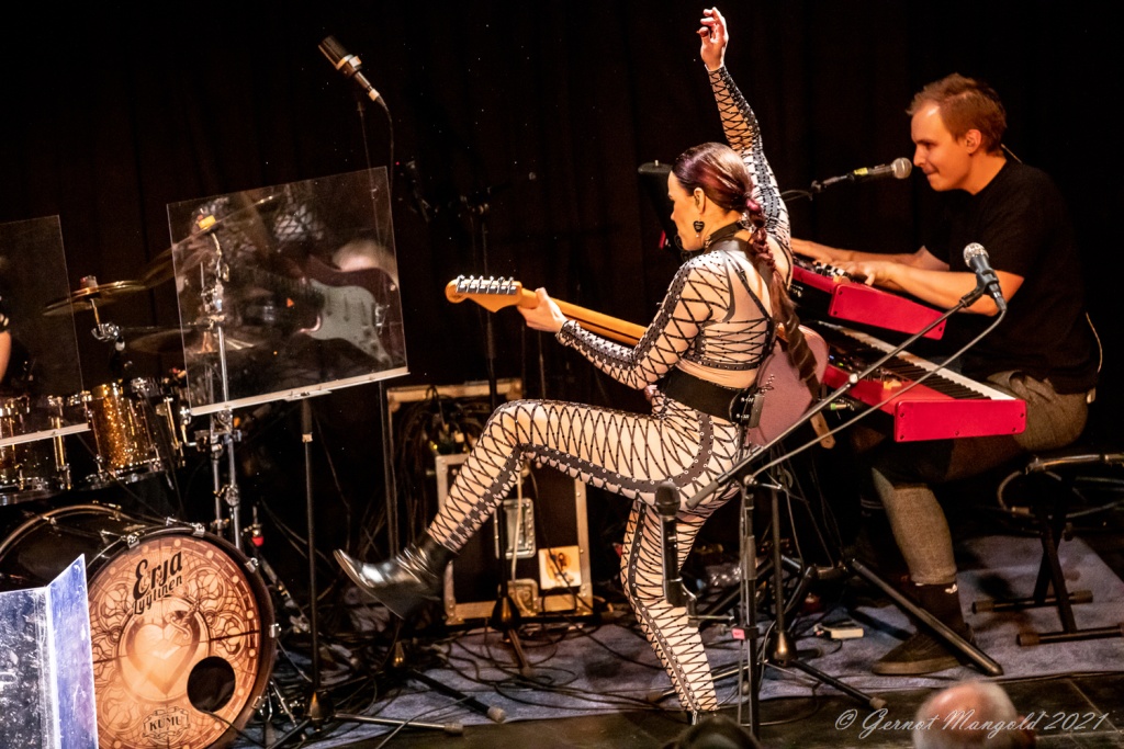 Nach einer etwa 30-minütigen Umbaupause betrat dann Erja Lyytinnen, scheinbar nur mit einem grobmaschigen Netz bekleidet mit ihrer Band die Bühne. Die Sittenwächter oder womöglich eifersüchtige Ehefrauen können an dieser Stelle aber direkt beruhigt werden, auf das, was man durch das scheinbare Netz schaute, war hellbraun beiger Stoff.