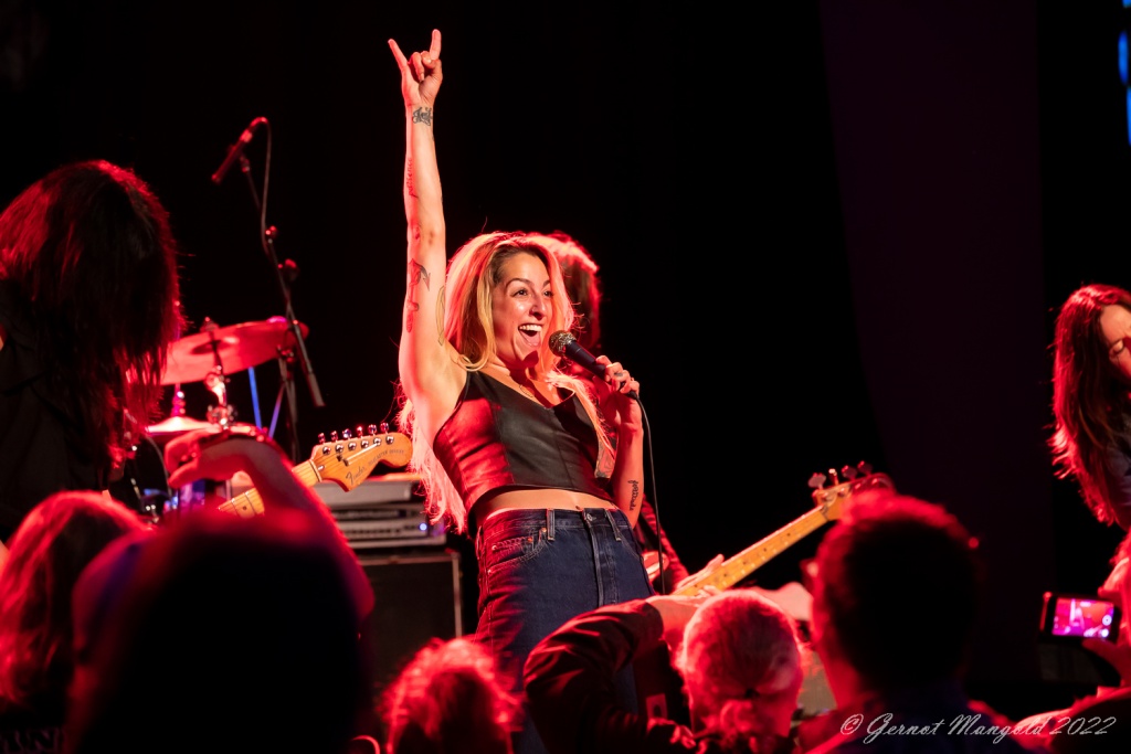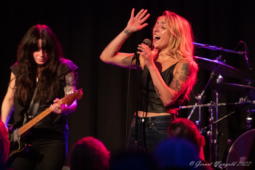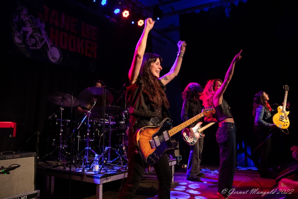 Die beiden Gitarristinnen Tina T-Bone Gorin und Tracy Hightop wechselten sich in der Rhythmus- und Soloarbeit ab und legten so manche feurigen Soli aufs Parkett und sparten dabei nicht mit dem dazu gehörenden Posen. Grundlage des Sounds war das rhythmische Treiben von Hail Mary Zadroga am Bass und vom Hahn im Korb Lightnin` Ron Salvo am Schlagzeug, die auch mit kurzen eingestreuten Soli glänzen konnten.