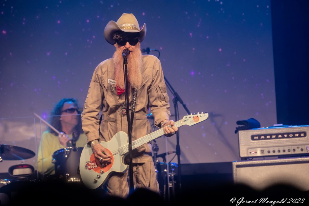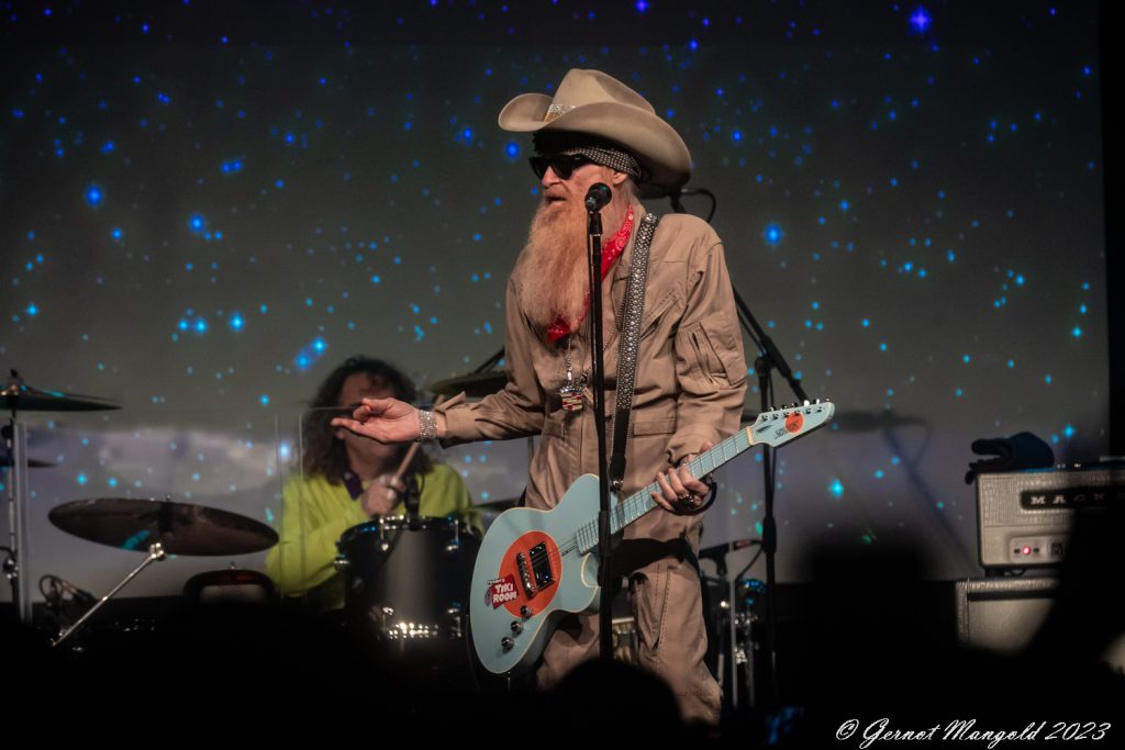 Im weiteren Verlauf präsentierte der kauzige Langbartträger aus Houston, wie erwartet, eine gelungene Mischung aus Stücken seinen Solophasen (u. a. „More-More-More“, „Missin‘ Yo Kissin'“, „The Devil Is Red“, „Treat Her Right“) und eine gut zusammengestellte Auswahl der vielen ZZ Top-Klassiker wie u. a. „Beer Drinkers And Hell Raisers“,“Gimme All Your Lovin'“, „Blue Jean Blues“, „Francine“, „Sharp Dressed Man“, „Thunderbird“ oder das launige „Tube Snake Boogie“.