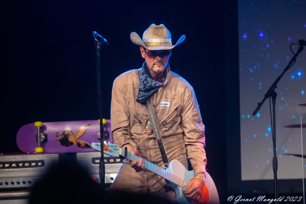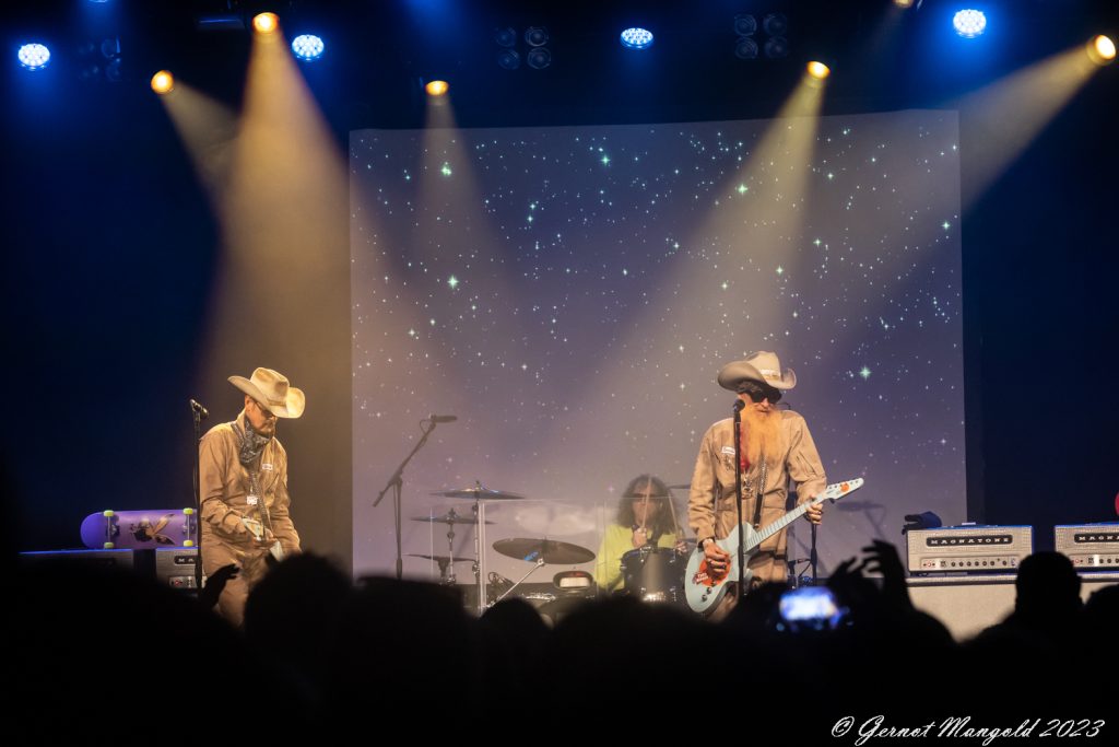 Um 21:05 Uhr nahm der sogar Frank Beard ein wenig ähnlich wirkende John Douglas seinen Platz ein, und kurze Zeit später tauchten dann Billy und sein Compagnon Austin Hanks mit Cowboyhüten und Blaumännern (man fühlte sich so ein wenig an die „El Loco“-Zeit erinnert, als ich Gibbons & Co. zum ersten Mal live erlebt habe), hier allerdings eher Beigemänner, bekleidet auf der Bühne auf und gingen mit dem ZZ Top-Klassiker „She Got Me Under Pressure“ direkt in die Vollen.