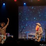 Kommen wir aber jetzt zum Positiven. Was schon in der Umbaupause gefiel, war das minimalistische, aber sehr stilvolle Bühnenbild samt einer mittigen Leinwand, vor der die Schlagzeuganlage von Douglas positioniert war. Links und rechts waren dann jeweils retro-stylische Magnatone-Boxen und -Verstärker aufgebaut, auf denen nur jeweils zwei umgedrehte, knallig-leuchtfarbene Skateboards hingestellt waren. Mit dem im Hintergrund gezeigten (texanischen) Sternenhimmel und den wechselnden Lichtspielen, ergaben sich schöne, schlichte und sehr geschmackvolle Effekte.