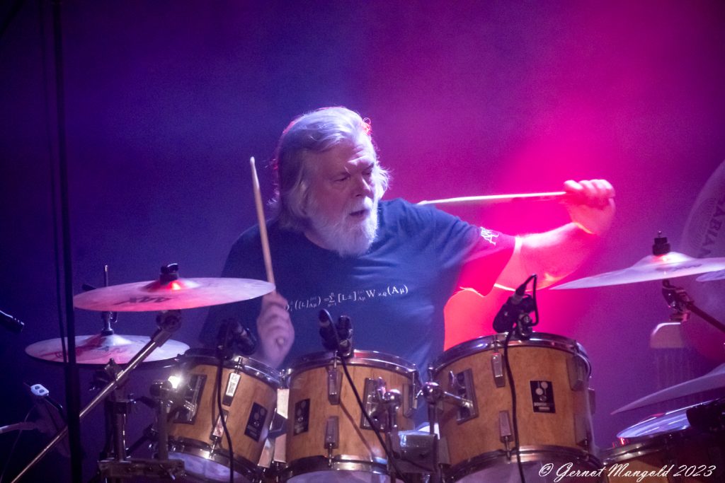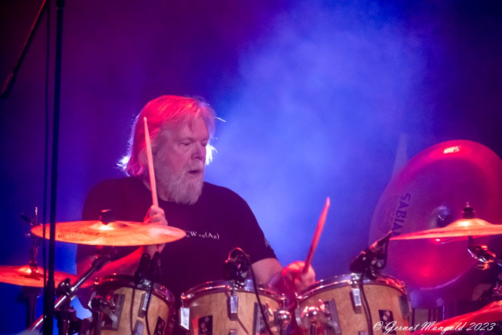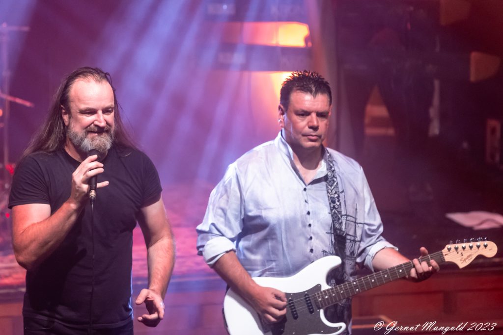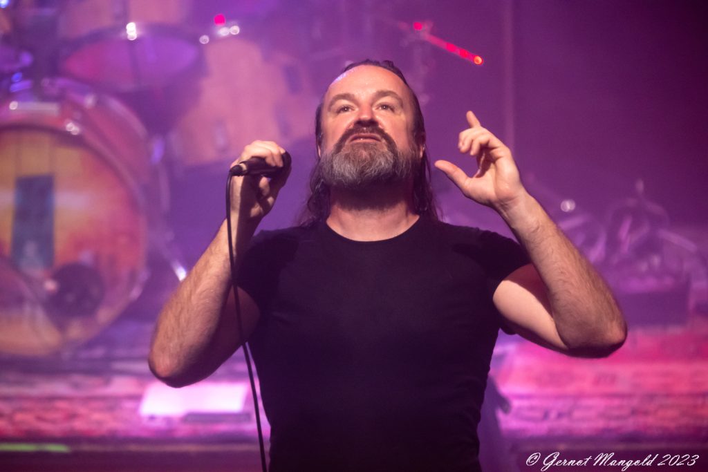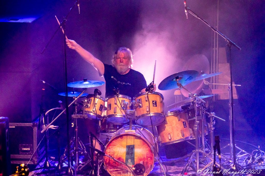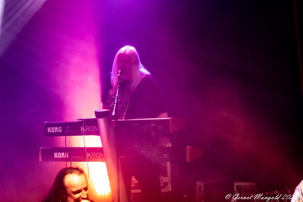 Drummer Mick Pointer und Keyboarder Clive Nolan, die beiden einzig verbliebenen Gründungsmiglieder, wobei der seit 1997 mitspieldende Mitchel auch schon zum Inventar gehört, stehen erhöht auf dem Podest in der zweiten Rheihe der Bühne. Dabei bringt insbesondere Nolan an den Keyboards athmpsphärische progressive Elemente in den oft harten und gut abgemischten Sound, während Pointer an den Drums ganz unaufgeregt den Takt vorgibt.