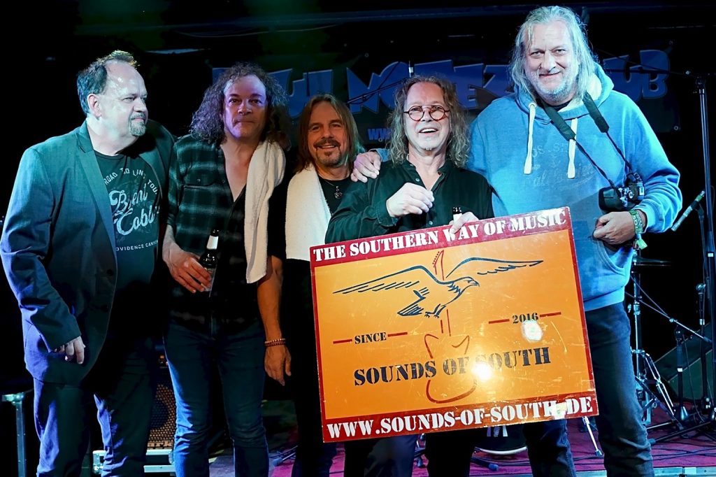 Die eigeforderte Zugabe wurde wieder, wie vor zwei Jahren, mit dem launigen „Angelina“ erfüllt, der Unterschied war diesmal die ausschließlich männliche Präsenz auf der Bühne bei der Harmoniegesangsinteraktion. Am Ende gab es noch das obligatorische Bild mit unserem SoS-Schild, netten Smalltalk und das Zeichnen der neuen CD.