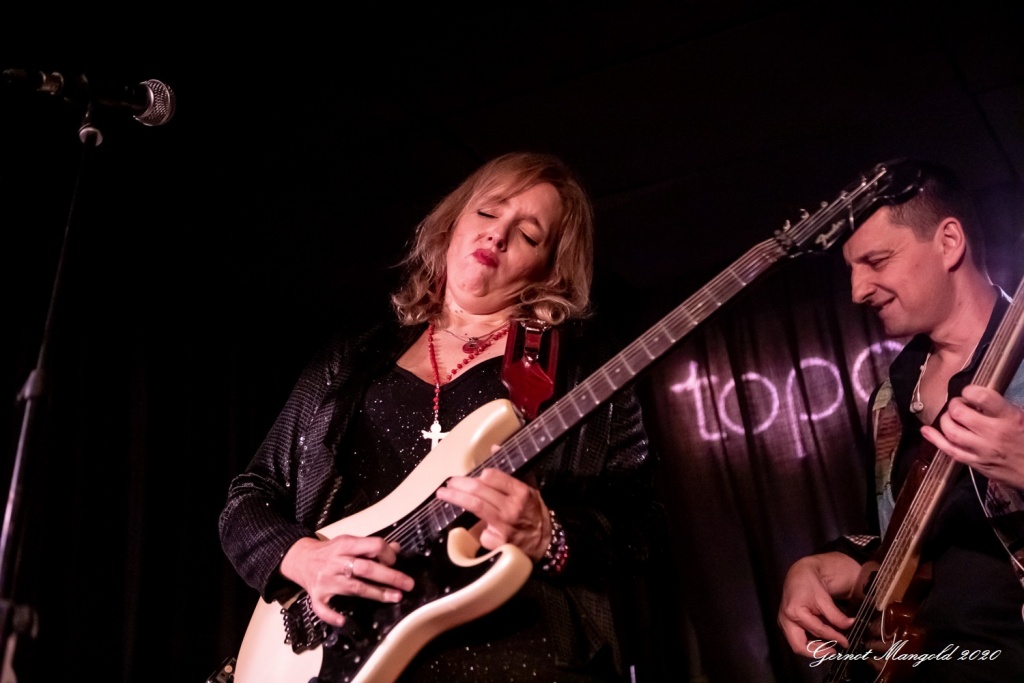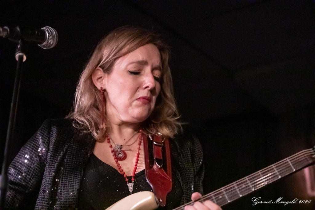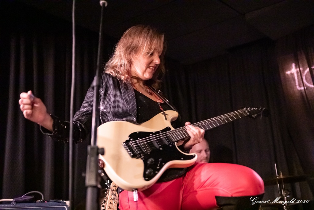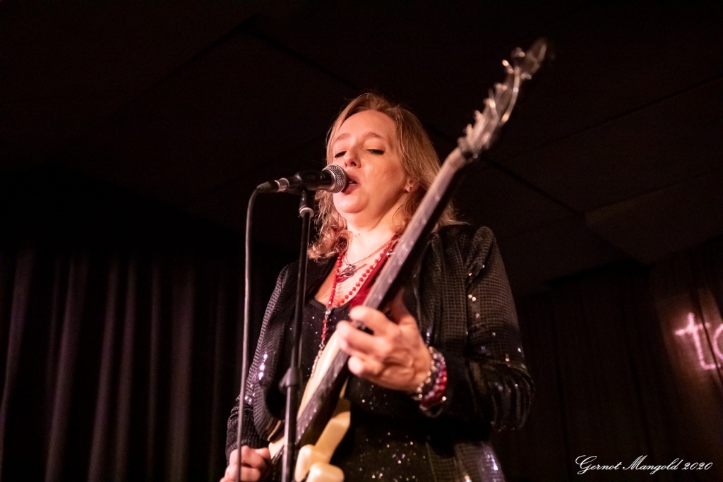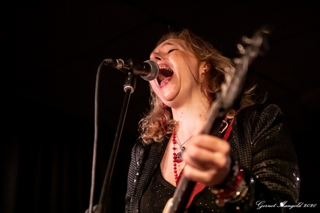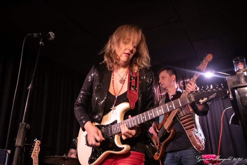 Vanesa (hatte vom Outfit her die Netzstrumpfhose diesmal gegen eine signalrote Hose mit kniehohen Stiefeln eingetauscht, um den Hals hatte sie wieder u. a. ihre lange rote Perlenkette mit Kreuz, die sich zwischenzeitlich immer wieder auf den Body ihrer Gitarre legte) spielte sich zum Auftakt des zweiteiligen Sets mit dem Standard-Klassiker „Hideaway“ die Finger warm, um dann mit Tracks wie „Rooster Blues“, If You Love Me“, Something’s Got A Hold On Me“, identisch zum letzten Mal, in den Gig hineinzufinden.