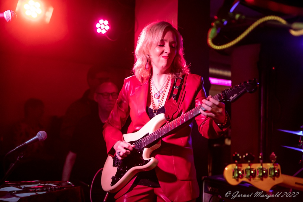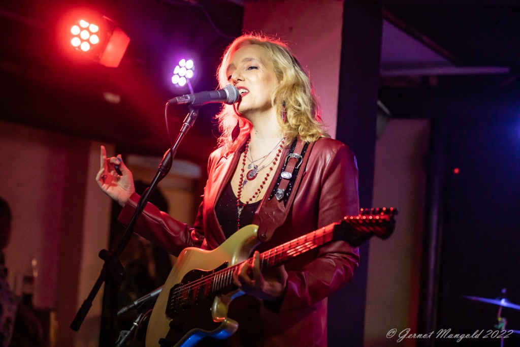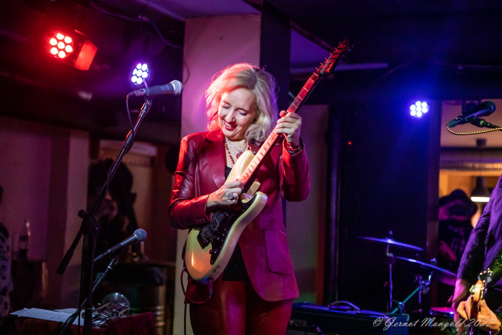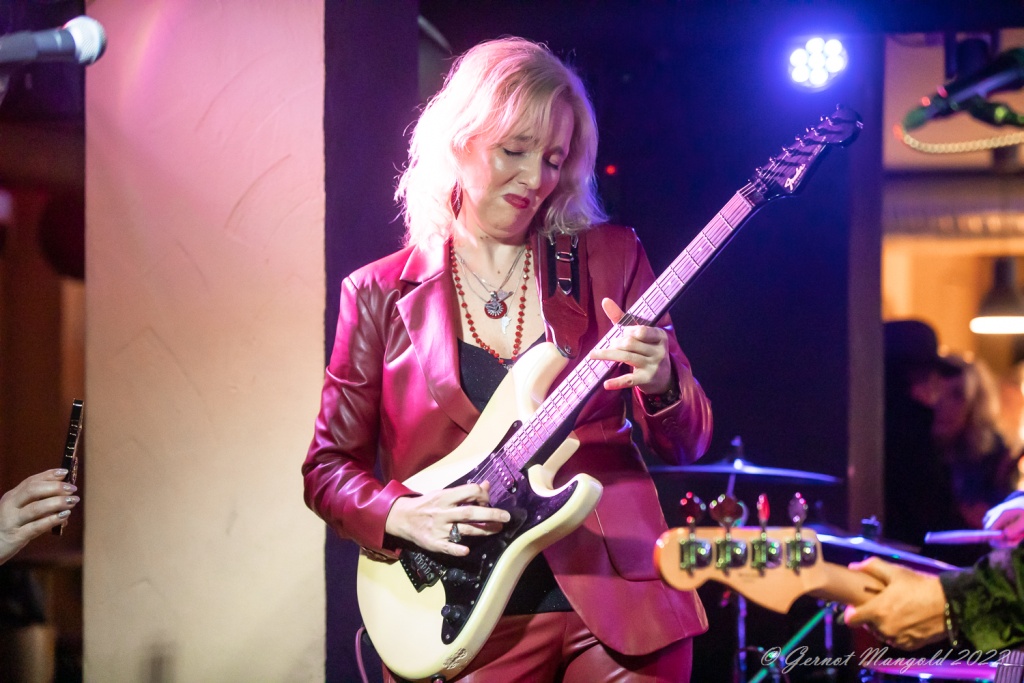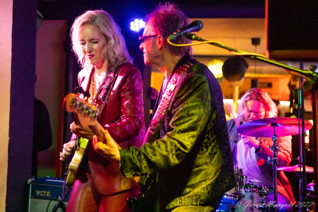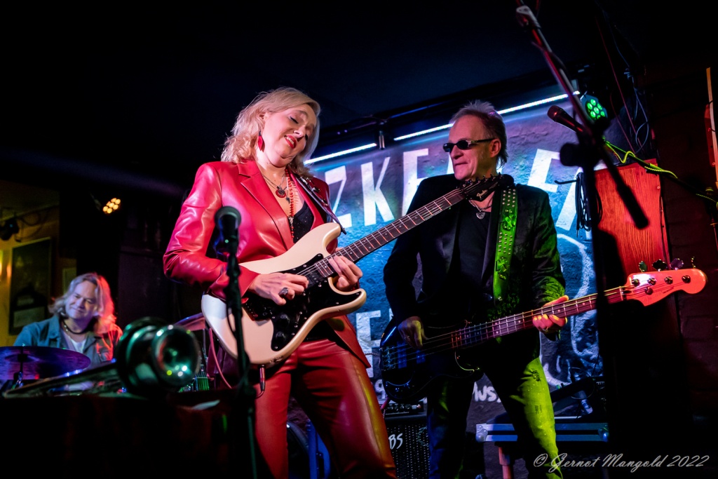Das Trio eröffnete zum Aufwärmen der Finger, Hände und Arme, mit dem für Vanesa typischen Freddie King-Instrumental „Hideaway“. Danach stand dann aber das brandaktuelle Album „Visiones“ im Fokus, das, soweit Gernot anmerkte, auch bis auf einziges Stück, komplett vorgestellt wurde, wobei Vanesa bei den auf spanisch vorgetragenen, oft Bolero-artigen Stücken, ihren heimatlichen Wurzeln, immer wieder Tribut zollte oder bei den englischen Tracks dann Blues-rockig ihre Fingerfertigkeit auf der E-Gitarre avisierte.