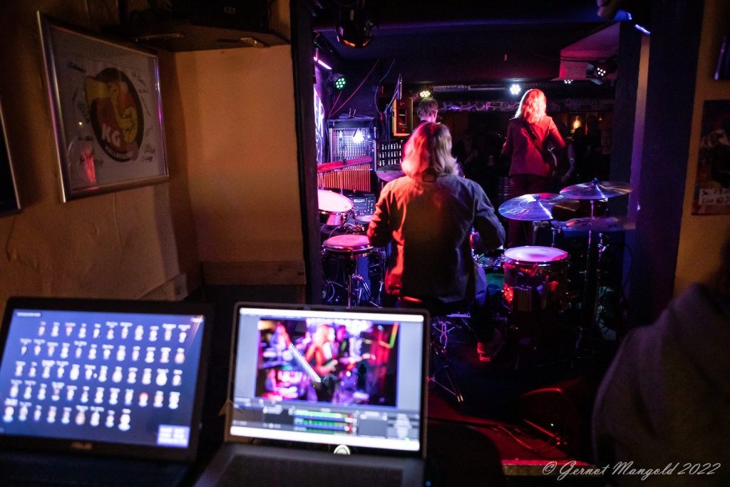 Die Situation war jedenfalls so: Kollege Gernot war vor Ort im Jazzkeller in Krefeld zum Fotografieren unter den 40 erlaubten Leuten anwesend, ich mit Kuli und Block vor dem heimischen Fernseher sitzend. Im Club selbst verlief laut Gernot alles bestens, toller Sound, spielfreudige Band, mit der gut aufgelegten Fronterin Vanesa Harbek (deren Verwandte in Buenos Aires auch per Livestream dabei waren), Rockmusik-Tausendsassa Martin Engelien und Axxis-Drummer Dirk Brand, die im Trio für gute Stimmung sorgten.