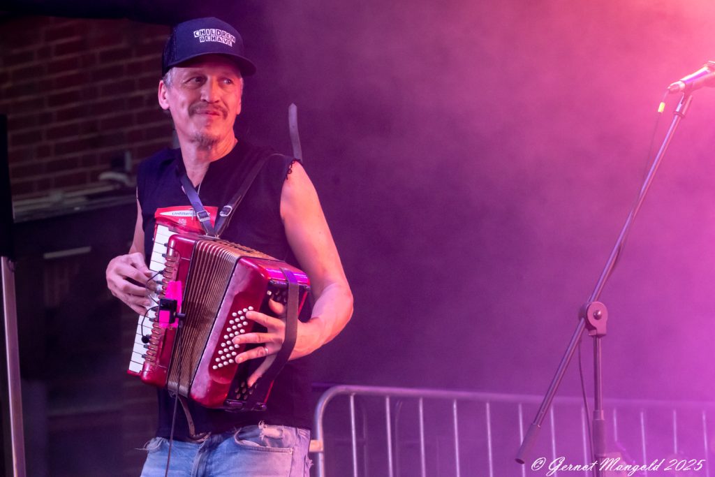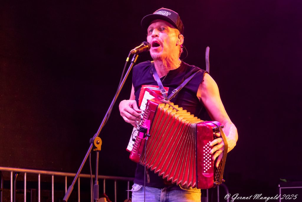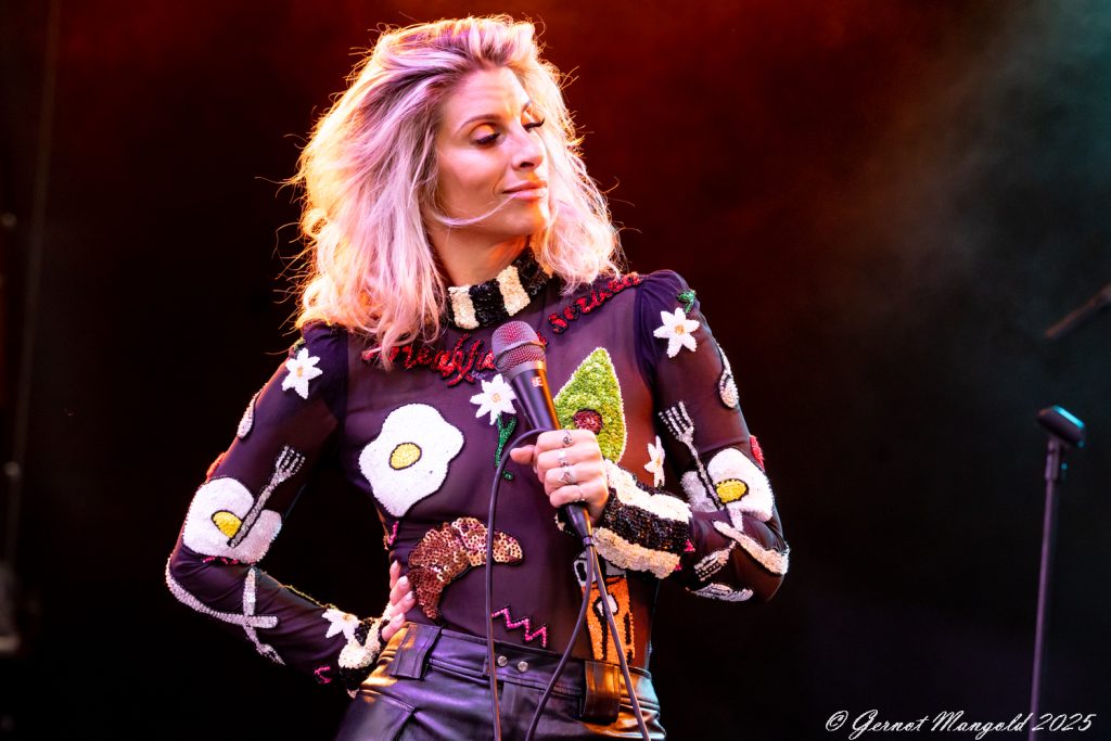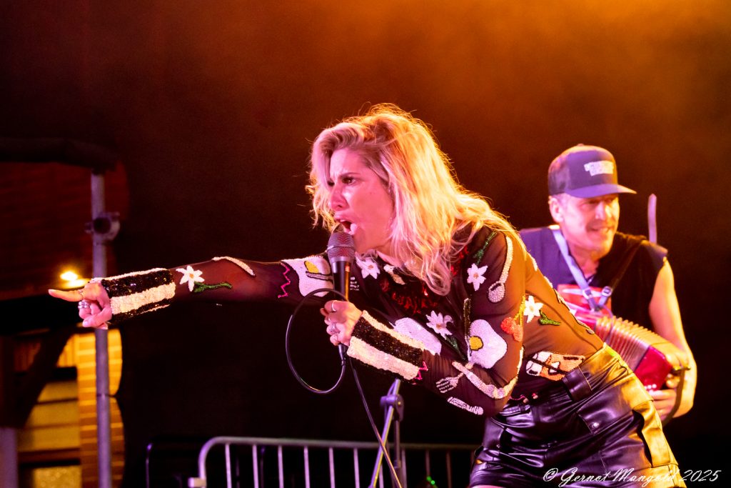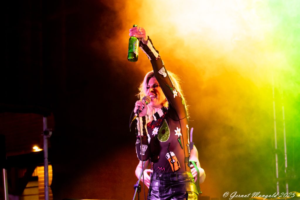 Auffällig war diesmal der stark keltische Einschlag der Nummern, man hatte teilweise das Gefühl, im Biergarten eines irischen Pubs zu sitzen. Monique (nach wie vor ein Blickfang – „Ich träume heute Nacht wohl von Spiegeleiern“ konstatierte ein Sitznachbar angesichts der drapierten Stoff-Applikationen auf ihrer teildurchsichtigen Bluse …), überzeugte mit ihrer gewohnt mitnehmenden, sympathischen, engagierten, wibbeligen, frechen und gelenkigen Performance auf der Bühne, als natürlich auch am Mikro.